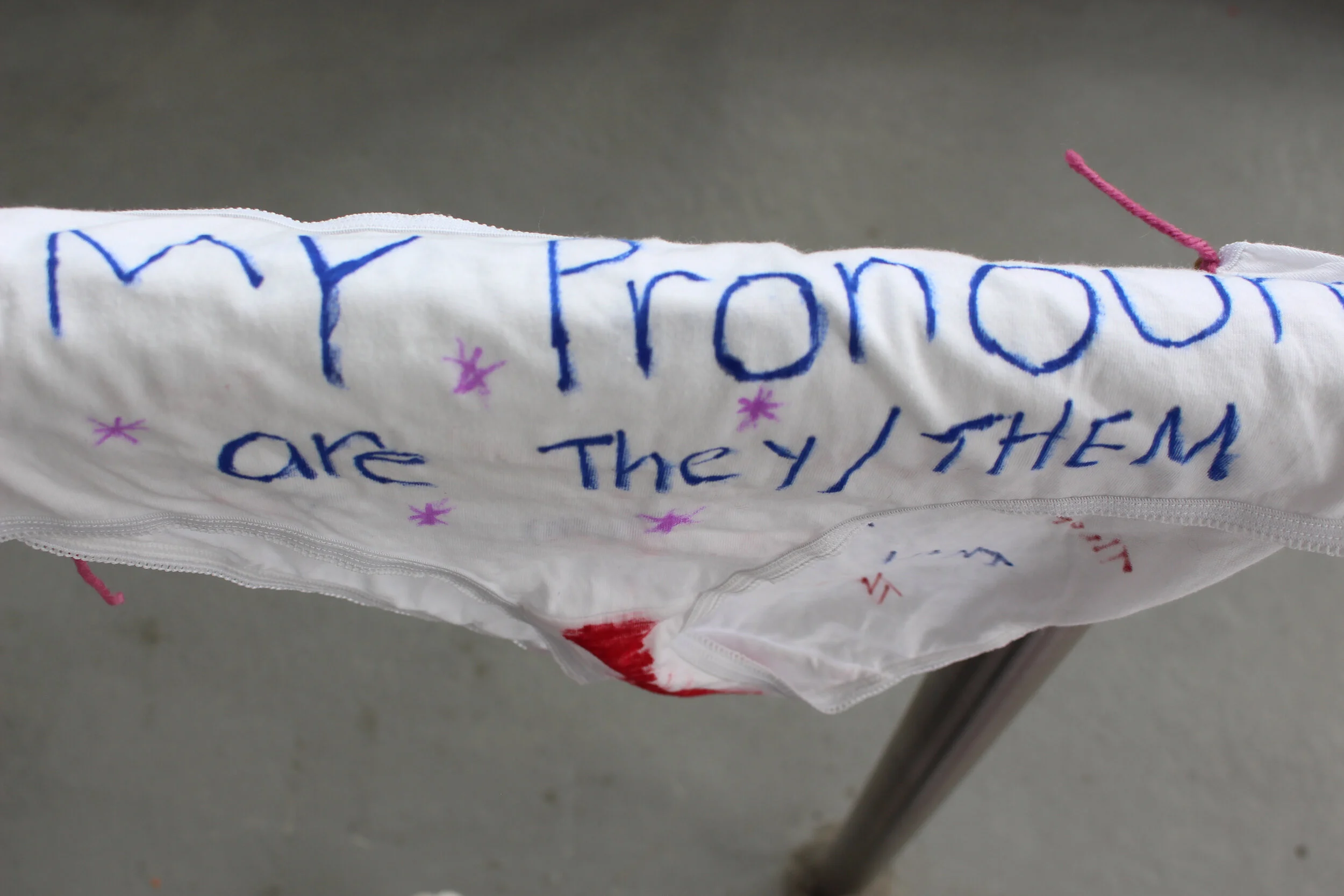 In this iteration of Whorearchy, Kitoko took a blanket that was the site of violence and laid it on the floor. After convesations with gallery guests, they covered the blankets with underwear. The pieces of underwear all had quotes, questions and statements that came from the conversations.
